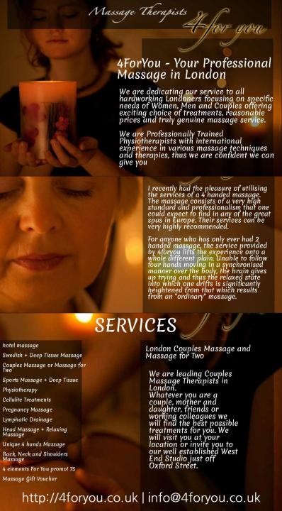 http://4foryou.co.uk/ The Best Massage you'll ever have! Meet a Team of talented and experienced London Massage Therapists, educated to MSc Physiotherapy degree. Deep tissue massage, sports, physio, couples massage, pregnancy massage, prenatal, swedish massage at a comfort of our studio, outcall massage service in London to your home, hotel or office.