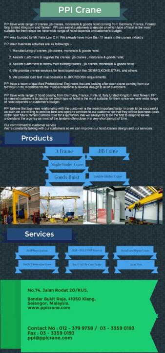 http://www.ppicrane.com/install_and_repair_crane.html | PPI Crane supplies.... single girder crane, double girder crane, a-frame, JIB crane and goods hoist. We have a team of qualified professional engineers