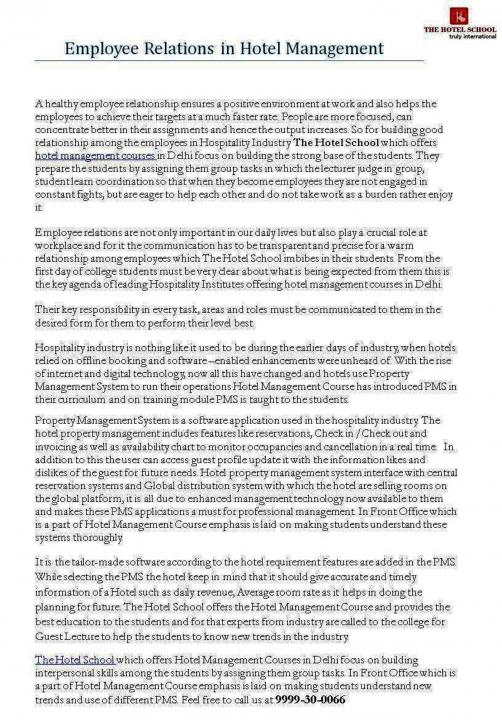 http://thehotelschool.com/hotel-management-courses.html | The Hotel School which offers Hotel Management Courses in Delhi focus on building interpersonal skills among the students by assigning them group tasks. In Front Office which is a part of Hotel Management Course emphasis is laid on making students understand new trends and use of different PMS.