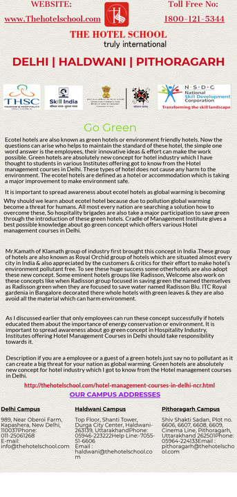 http://thehotelschool.com/hotel-management-courses-in-delhi-ncr.html | Institutes offering Hotel Management Courses in Delhi should take responsibility to spread awareness about go green concept in Hospitality Industry.