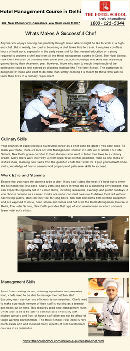 https://thehotelschool.com/makes-a-successful-chef.html | Your chances of experiencing a successful career as a chef won't be great if you can't cook. To learn your trade, one of the best courses is being taught at The Hotel School, New Delhi which provides great future prospects.