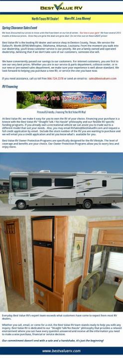 http://www.bestvaluerv.com Best Value RV is the leading RV dealer and service shop in Denton County, Texas. We service the Dallas/Ft. Worth (DFW) Metroplex, Oklahoma, Arkansas, Louisiana. From the moment you walk into our dealership, you’ll know customer service is our priority. We are a family owned and operated dealership.