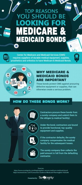 This info-graphic titled Top Reasons You should be Looking for Medicare & Medicaid Bonds’ provides us an overview of Medicare Bonds The Centers for Medicare and Medicaid Services implanted a bonding requirement in 2009 intending to curb medical billing fraud by physicians or medical practitioners. Most suppliers of lasting medical equipment, prosthetics & orthotics, and supplies must file a $50,000 surety before they can bill for Medicare.