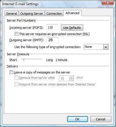 For Incoming Server (POP3): 110 and Outgoing Server (SMTP): 26